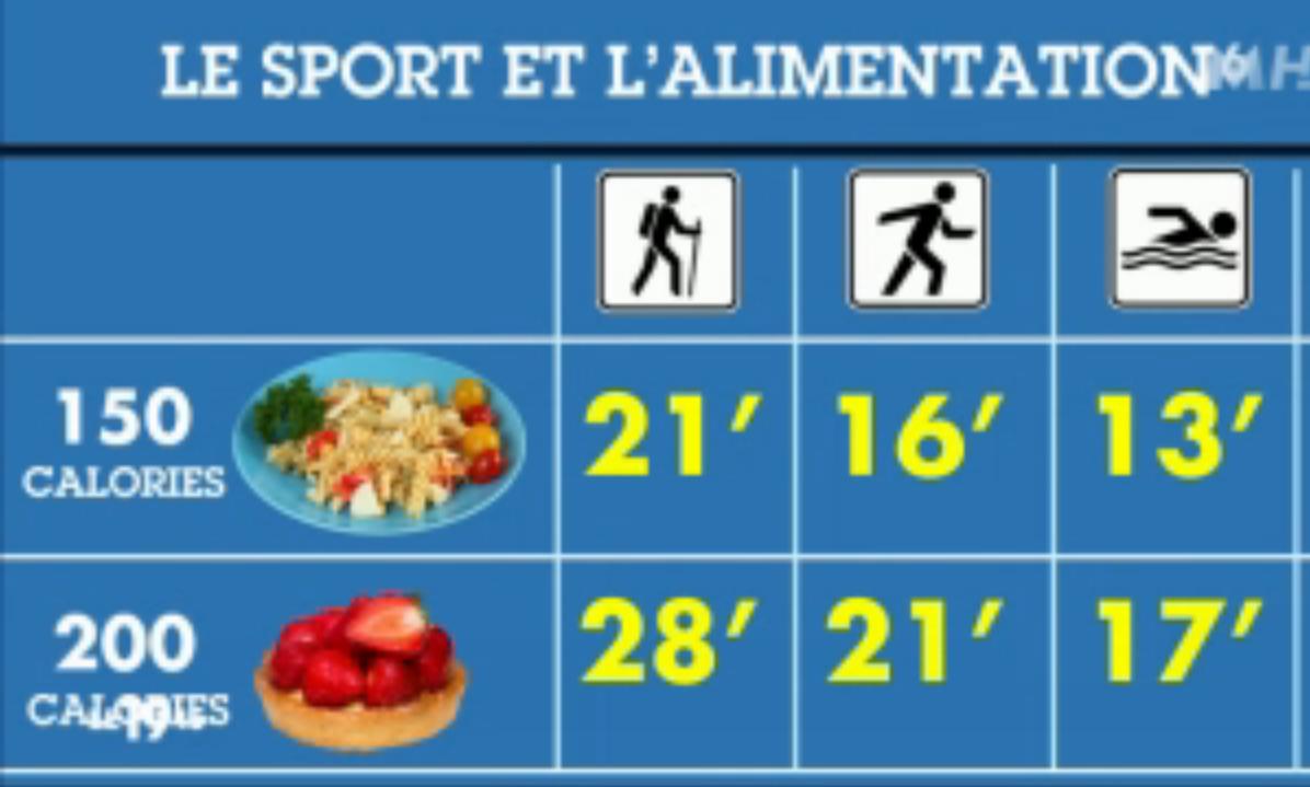 * Pour éliminer une part de tarte il vous faudra pratiquer 28min de macrhe, 21 minutes de jogging ou 17minutes de natation